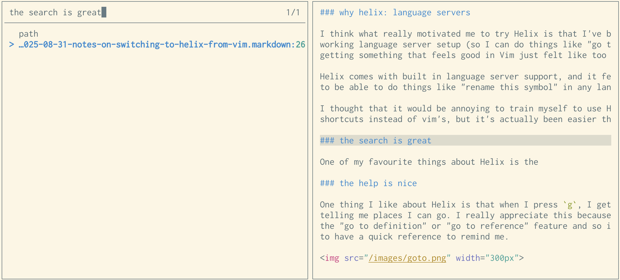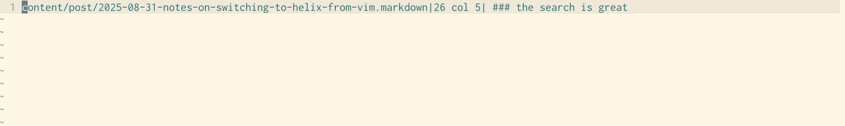 I think what motivated me to try Helix is that I’ve been trying to get a working language server setup (so I can do things like “go to definition”) and getting a setup that feels good in Vim or Neovim just felt like too much work.